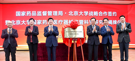 国家药品监督管理局与北京大学签署战略合作协议,共建北京大学国家药品医疗器械监管科学研究院,共同促进药品监管科学发展。国家药监局党组书记李利和北京大学校长郝平共同为北京大学国家药品医疗器械监管科学研究院揭牌。国家